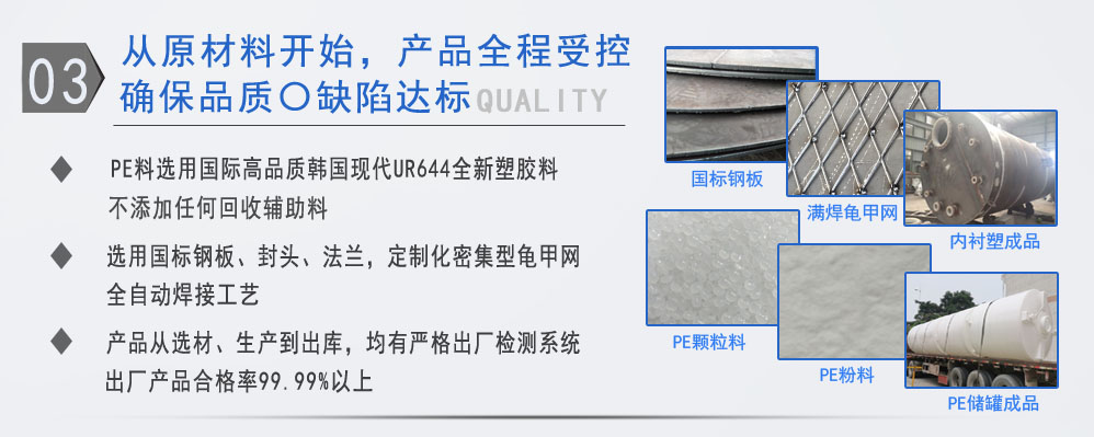 公司有鋼襯塑PE/PO、PE全塑、碳鋼、不銹鋼四大系列100多個品種,專注于常壓儲存容器生產,其產品包括鋼襯塑儲罐管口一體成型PE儲罐碳鋼儲罐不銹鋼儲罐、反應釜、攪拌罐、離子交換柱、鋼襯PE/PO儲罐、塑料儲罐、鹽酸儲罐硫酸儲罐等等。更大限度滿足廣大客戶的各種需求,同時可以根據客戶的需要加工定制各種防腐設備。